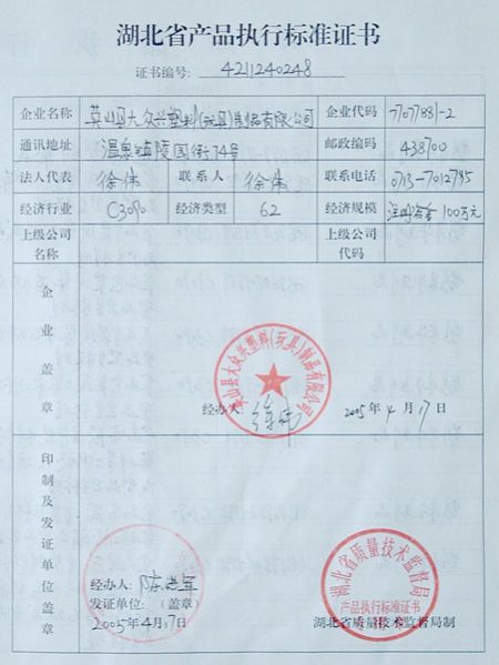 湖北省產品執行標準證書